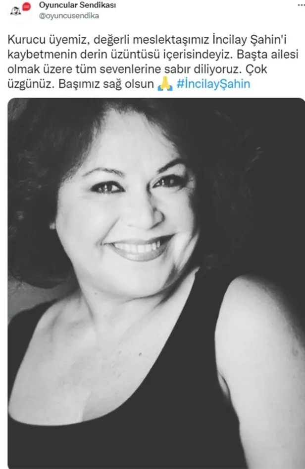 Oyuncular Sendikası sosyal medya hesabından İncilay Şahin ile ilgili bir paylaşım gerçekleştirdi. Kayserili olan İncilay Şahin 60 yaşındadır.
