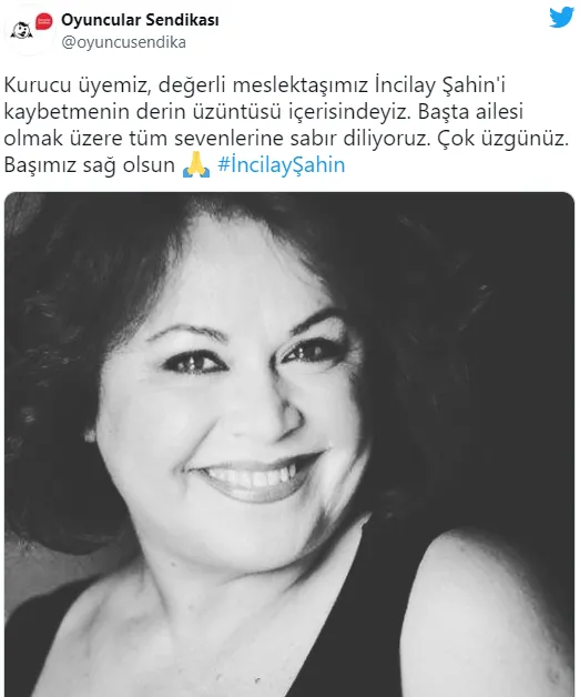 Kariyeri boyunca pek çok dizi ve filmde rol alan İncilay Şahinin oynadığı diziler arasında Adını Feriha Koydum Umutsuz Ev Kadınları gibi yapımlar. Oyuncular Sendikasının sosyal medya hesabından yap. Kariyeri boyunca pek çok dizi tiyatro ve sinema filminde oynayan oyuncu İncilay Şahin hayatını kaybetti.